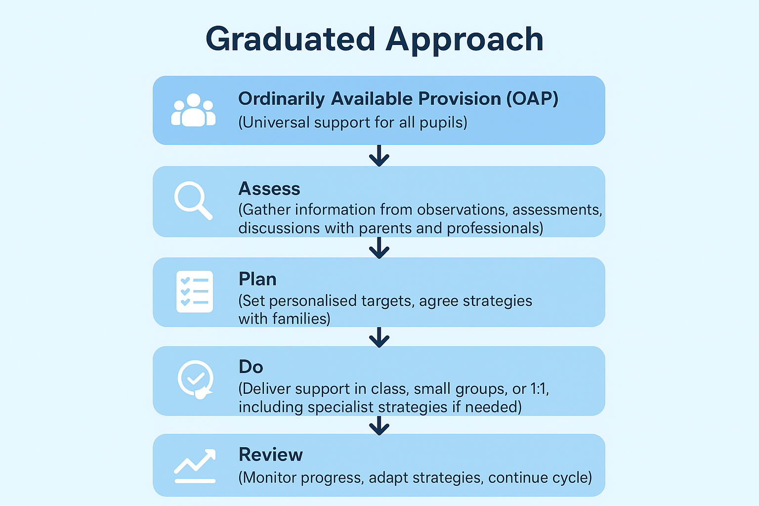 At Orchard View Primary Academy, we follow the Graduated Approach as outlined in the SEND Code of Practice. This is a four-stage cycle—Assess, Plan, Do, Review—designed to ensure pupils with additional needs receive the right support at the right time.
